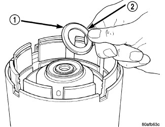 47. Install the #3 thrust washer (1) to the underdrive shaft assembly (2). Be sure five tabs are seated properly.