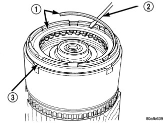 38. Tap reaction plate (3) down to allow installation of the reverse clutch snap ring (1) Install reverse clutch snap ring (1).
