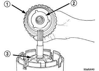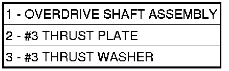 48. Install the number three thrust plate (3) (note 3 tabs) to the bottom of the overdrive shaft assembly (1). Retain with petrolatum or transmission assembly gel (2).