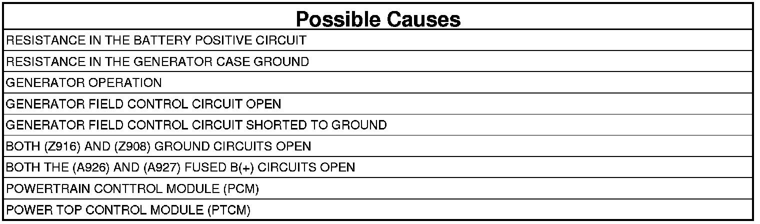 NOTE: If charging system voltage readings are acceptable on both the scan tool and at the (A926 and A927) Fused (B+) circuits at the Power Top Control Module and no other modules are reporting this DTC then replacing the Power Top Control Module is the most likely course of action.