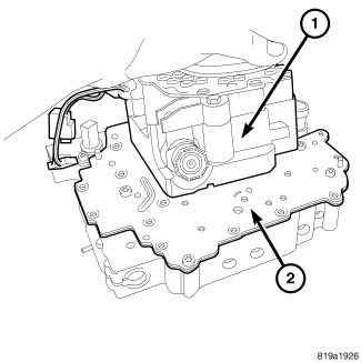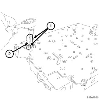 8. Install the bolt (1) at the pressure control solenoid (2) and tighten to 6 Nm (50 in. lbs.).