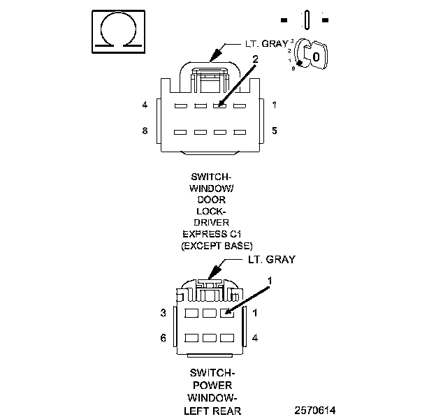 1. Measure the resistance between the Master Window Switch Left Rear (Down) circuit in the Driver Window Switch C1 connector and the Left Rear Window Driver (Down) circuit in the Left Rear Window Motor connector.