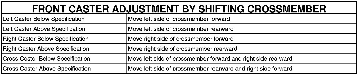 3. Shift front crossmember as necessary (See following tables) to bring camber or caster into specifications. When shifting crossmember, use care not to move other angles (camber or caster) that are within specifications, out of specifications.