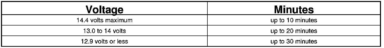 3. Battery chargers vary in the amount of voltage and current they provide. The amount of time required for a battery to accept measurable charging current at various voltages is shown in the Charge Rate Table. If the charging current is still not measurable at the end of the charging time, the battery is faulty and must be replaced. If the charging current is measurable during the charging time, the battery may be good and the charging should be completed in the normal manner.