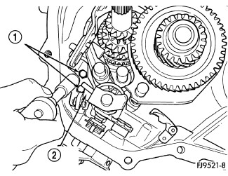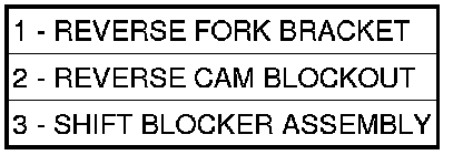14. Remove reverse fork bracket (1) and reverse cam block-out assembly (2).