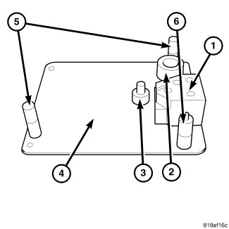 29. Remove the shift blocker assembly, the reverse shift fork (5) and the detent assembly from the bench fixture (4).