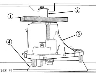 21. Turn transaxle over. Install transaxle (1) onto Bench Fixture 6785 (2). Verify shim spacers and adaptors are in position on Bench Fixture 6785. Install transaxle into shop press.