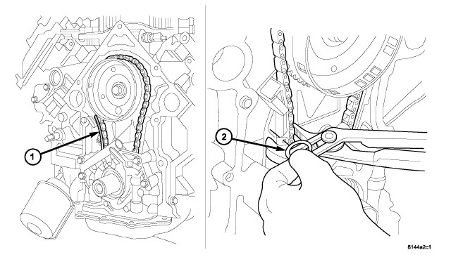 5. Place timing chain around both sprockets with timing marks aligned with the plated links.