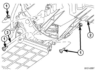 26. Position the heat shield (2), if equipped, onto the transmission housing and install the screw (1) and bolt (3) to hold the shield in place.