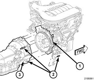 10. Raise transmission (3) and align the torque converter with the drive plate and the transmission converter housing with the engine block (1).