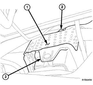 39. Install the engine mount heat shield (1) and tighten fastener (2).