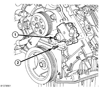 34. Install the three power steering pump (1) mounting bolts (2) through the access holes in the pulley and tighten the bolts to 28 Nm (21 ft. lbs.).