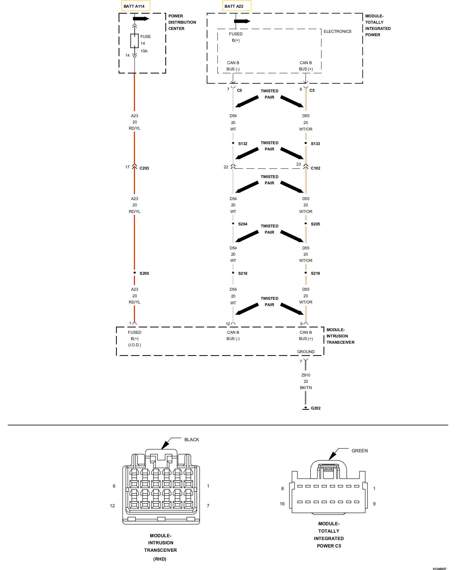 1. Measure the resistance of the (D54) CAN B Bus (-) circuit between the TIPM C5 harness connector and the Intrusion Transceiver Module harness connector.