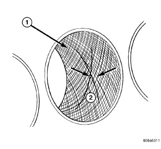 3. Honing should be done by moving the hone up and down fast enough to get a cross-hatch pattern (1). When hone marks intersect at 40-60 degrees (2), the cross hatch angle is most satisfactory for proper seating of rings.