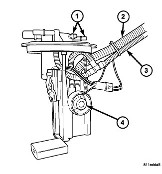 Top view of the right side fuel module with control valve (1), fuel supply fitting (2), fuel pressure regulator (3), and level sensor (4)