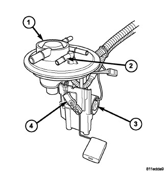 Left side fuel module with electrical connector (1), vapor fitting (2), and level sensor (3)
