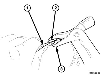 7. Carefully use the curved jaw (3) of the wheel weight pliers to compress and form the flattened spike of the male button half (2) on the back side of the seat belt webbing (1) until it is concave and entirely below the outer convex surface of the female button half.