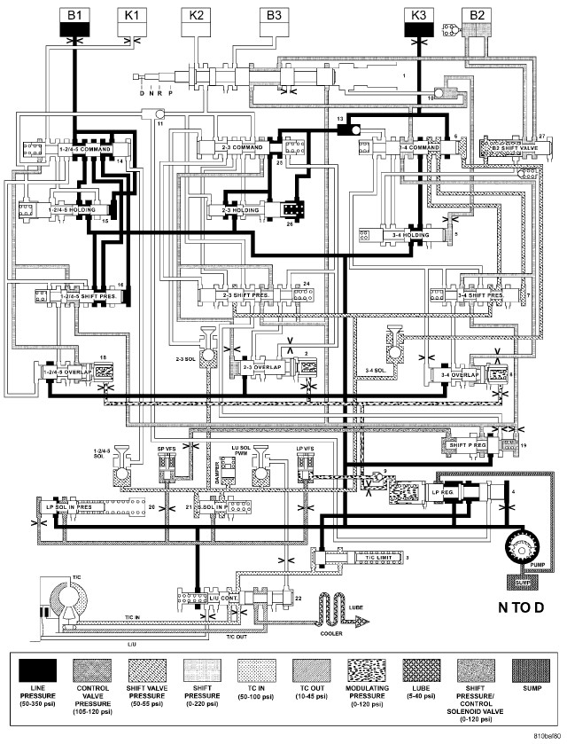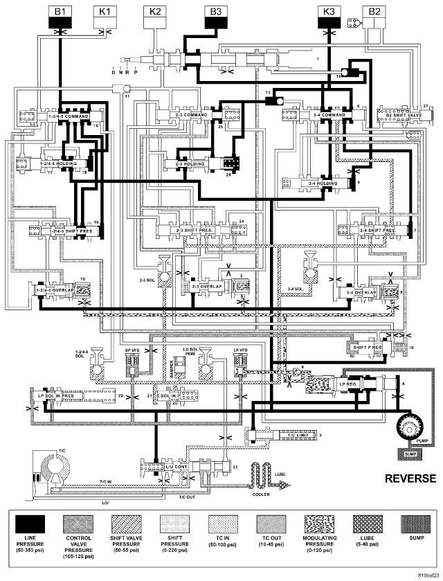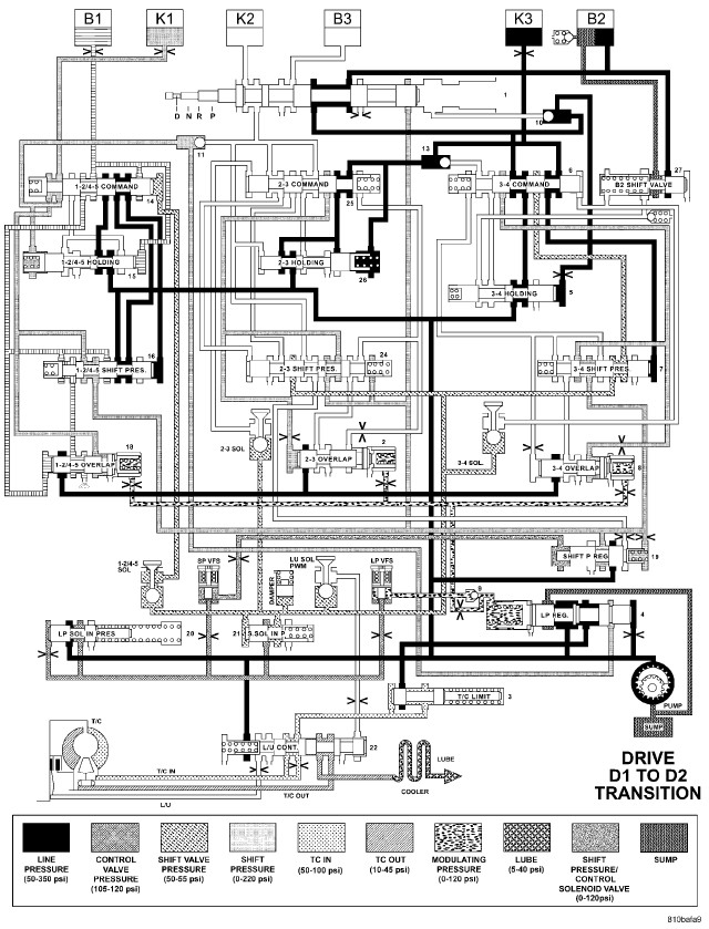 HYDRAULIC FLOW IN DRIVE - SECOND TO FIRST GEAR TRANSITION