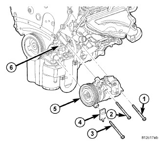 4. Tighten all three bolts that secure the A/C compressor to the engine in the following order to 26 Nm (19 ft. lbs.).