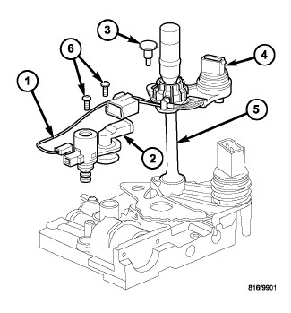 2. Remove the screws (6) holding the pressure control solenoid (1) and line pressure sensor (2) to the valve body.