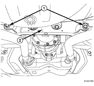 1. Loosen the four bolts (1) fastening the engine cradle (2) to the frame just enough to allow movement of the cradle.