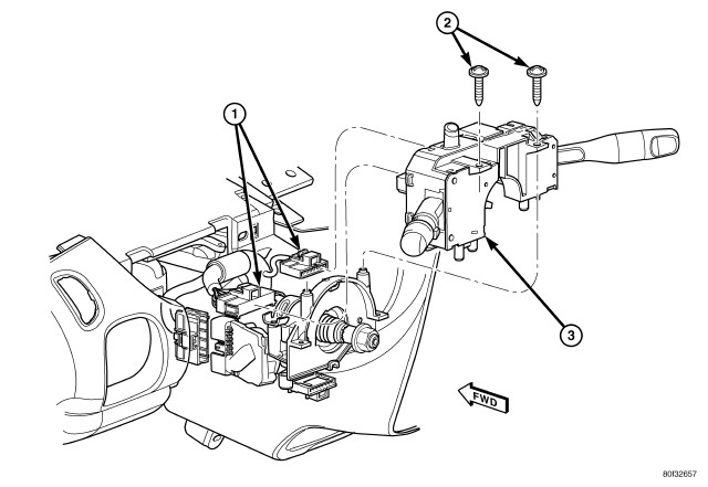 2. Install the multi-function switch mounting screws (2). Tighten the screws to 3 Nm (27 in. lbs.).