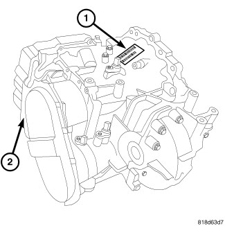 The 62TE transaxle is identified by a barcode label (1) that is fixed to the transaxle or the "PK" number (2).