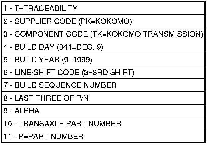 The label contains a series of digits that can be translated into useful information such as transaxle part number, date of manufacture, manufacturing origin, plant shift number, build sequence number, etc. Refer to for identification label breakdown.