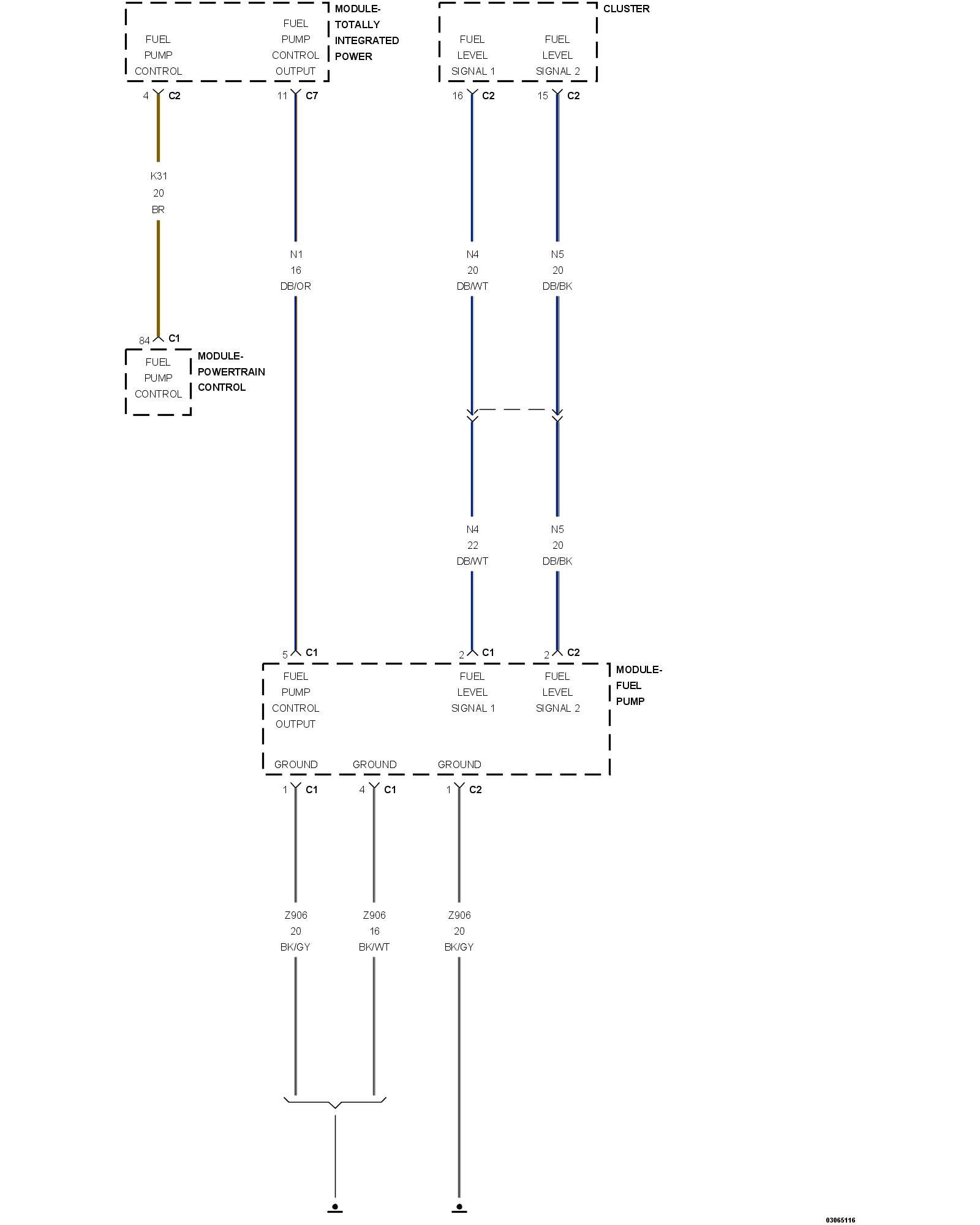 1. Using the wiring diagram/schematic as a guide, inspect the wiring and connectors between the Fuel Level Sensor and the Instrument Cluster (CCN).