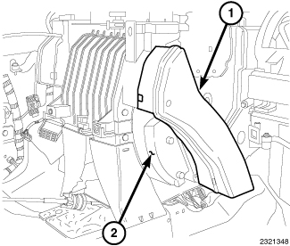 2. Disconnect the right floor duct (1) from the right side of the HVAC housing (2) and remove the duct.