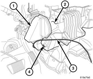 3. Remove the screw (4) that secures the left floor duct to the left side of the HVAC housing (2).