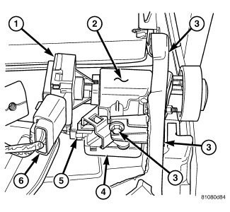 9. Reach up behind the left side of the center stack and disconnect the ignition switch electrical connector (6) and the WCM electrical connector (5).