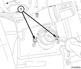 13. Remove the two ignition switch mounting screws (1) and remove one upper screw from the ignition cylinder support bracket. It will be necessary to detach the left side of the center instrument panel trim to gain access to one of the ignition switch mounting screws.
