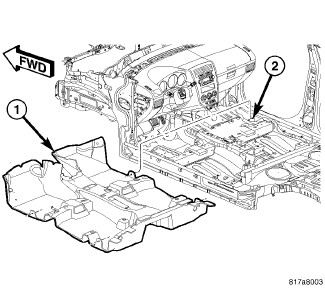 1. Install carpet into vehicle ensuring carpet (1) is aligned with tabs (2).