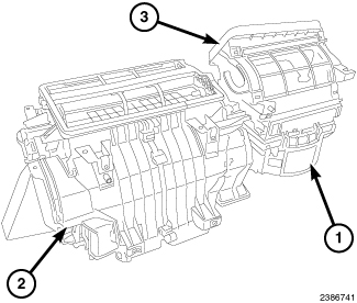 11. Position the blend door actuator (2) onto the left side of the air distribution housing (3). If necessary, rotate the actuator slightly to align the splines on the actuator output shaft with those in the blend door lever.