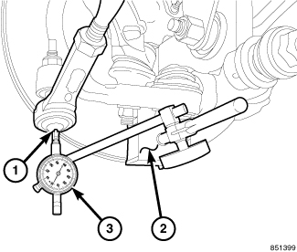 4. Attach a magnetic dial indicator (2) to the inside or outside of the brake rotor, then align the dial indicator's contact pointer (1) with the direction of the stud axis and touch the outer tie rod.