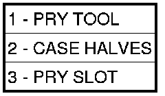 4. Place two screwdrivers (1) into the slots (3) provided in the case halves (2) near the dowels. Separate the case halves.