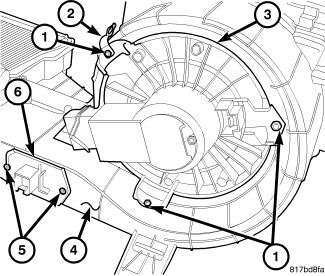 3. Install the six screws (3) and three metal clips (5) that secure the two halves of the HVAC housing together. Tighten the screws to 1.2 Nm (10 in lbs.). Make sure the metal clips are fully engaged to the housing halves.
