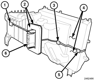 2. Install the two halves of the HVAC housing (4) together and engage the eight plastic retaining tabs (1). Make sure the retaining tabs are fully engaged.