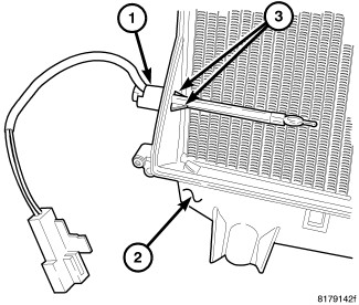 9. Install the evaporator temperature sensor (1) into the driver side of the HVAC housing (2). Make sure the retaining tabs (3) are fully engaged to the housing.