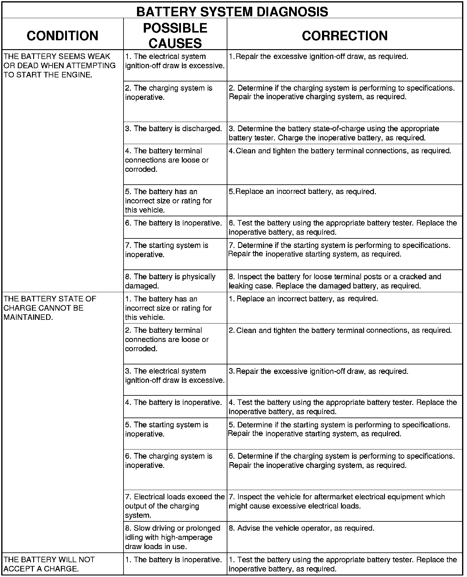 The battery, starting, and charging systems in the vehicle operate with one another and must be tested as a complete system. In order for the engine to start and the battery to maintain its charge properly, all of the components that are used in these systems must perform within specifications. It is important that the battery, starting, and charging systems be thoroughly tested and inspected any time a battery needs to be charged or replaced. The cause of abnormal battery discharge, overcharging or early battery failure must be diagnosed and corrected before a battery is replaced and before a vehicle is returned to service. The service information for these systems has been separated within this service manual to make it easier to locate the specific information you are seeking. However, when attempting to diagnose any of these systems, it is important that you keep their interdependency in mind.
