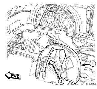 2. Install the push-pin (2) that secure the front wheelhouse shield to the body.