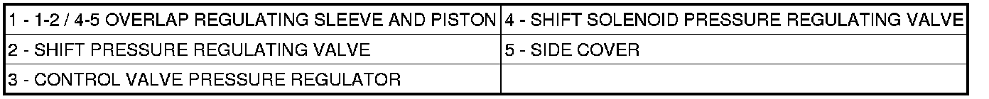 27. Remove 3-4 Holding Pressure Shift Valve assembly (2), 3-4 Command Valve assembly (3), 3-4 Shift Pressure Shift Valve assembly (4) and the 3-4 Overlap Regulating Valve Sleeve and Piston assembly (5) from the valve body.