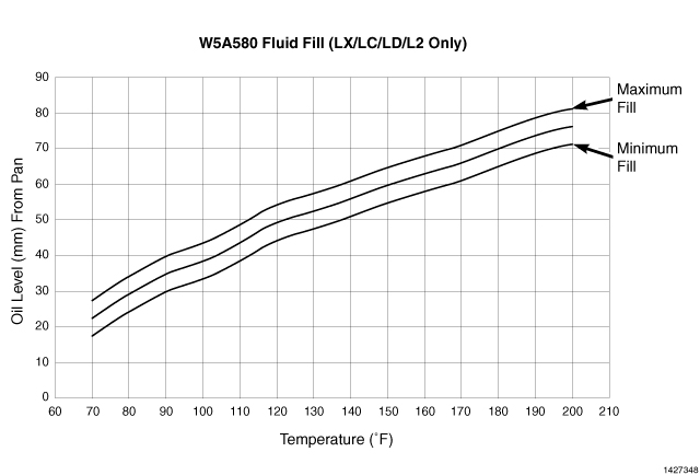 7. The transmission Oil Dipstick has indicator marks every 10 mm. With the transmission in PARK, determine the height of the oil level on the dipstick. Using the height, the transmission temperature and the transmission fluid graph, determine if the transmission oil level is correct.