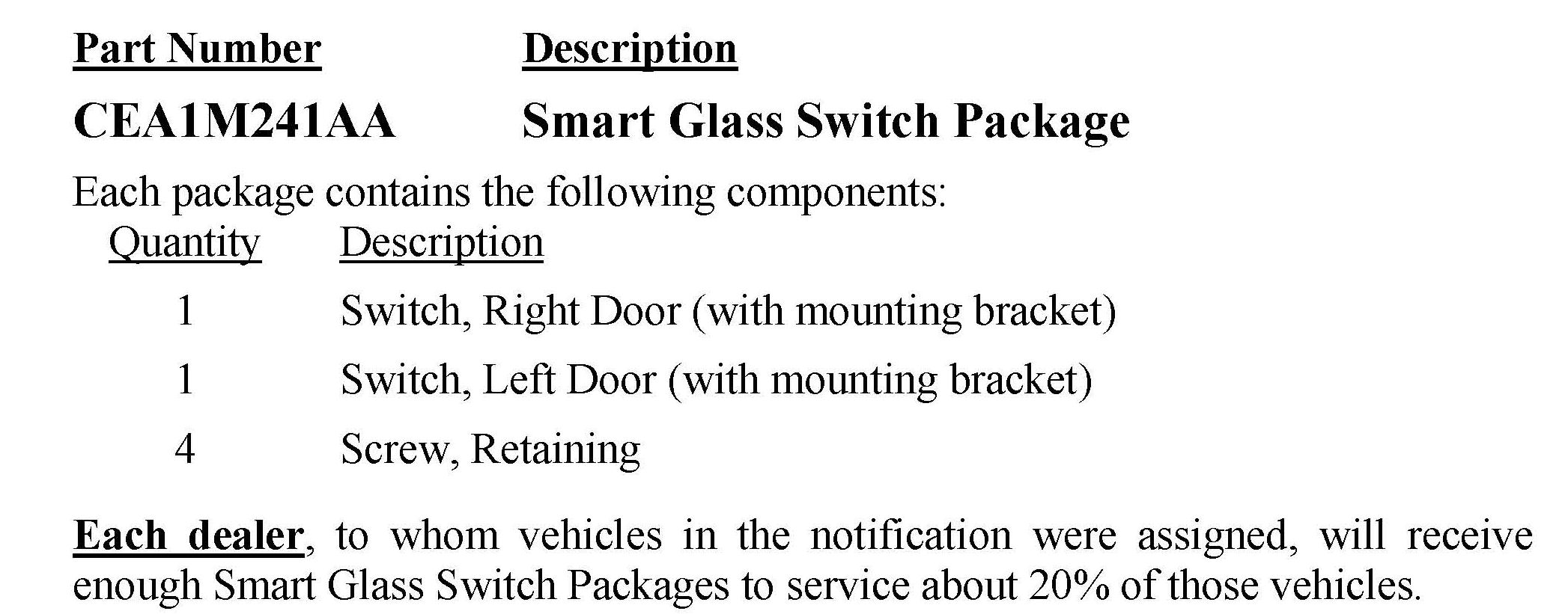 The smart glass switch on about 8,400 of the above vehicles may have improper heat stakes which could cause a continuous unintended smart glass operation. Continuous activation of the smart glass feature, when not intended, could cause the battery to discharge to a point where the engine will not crank.