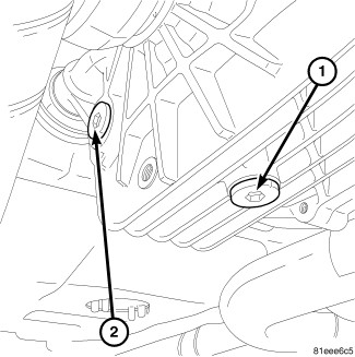 12. Remove rear axle fill plug (2). Fill axle with 1.2L (1.2 qts.) of Mopar(R) 75W-90 Synthetic Gear and Axle Lubricant and add one 0.03 L (4 oz.) bottle of MOPAR(R) Limited Slip Additive Friction Modifier. Install fill plug and torque to 35 Nm (25 ft. lbs.).