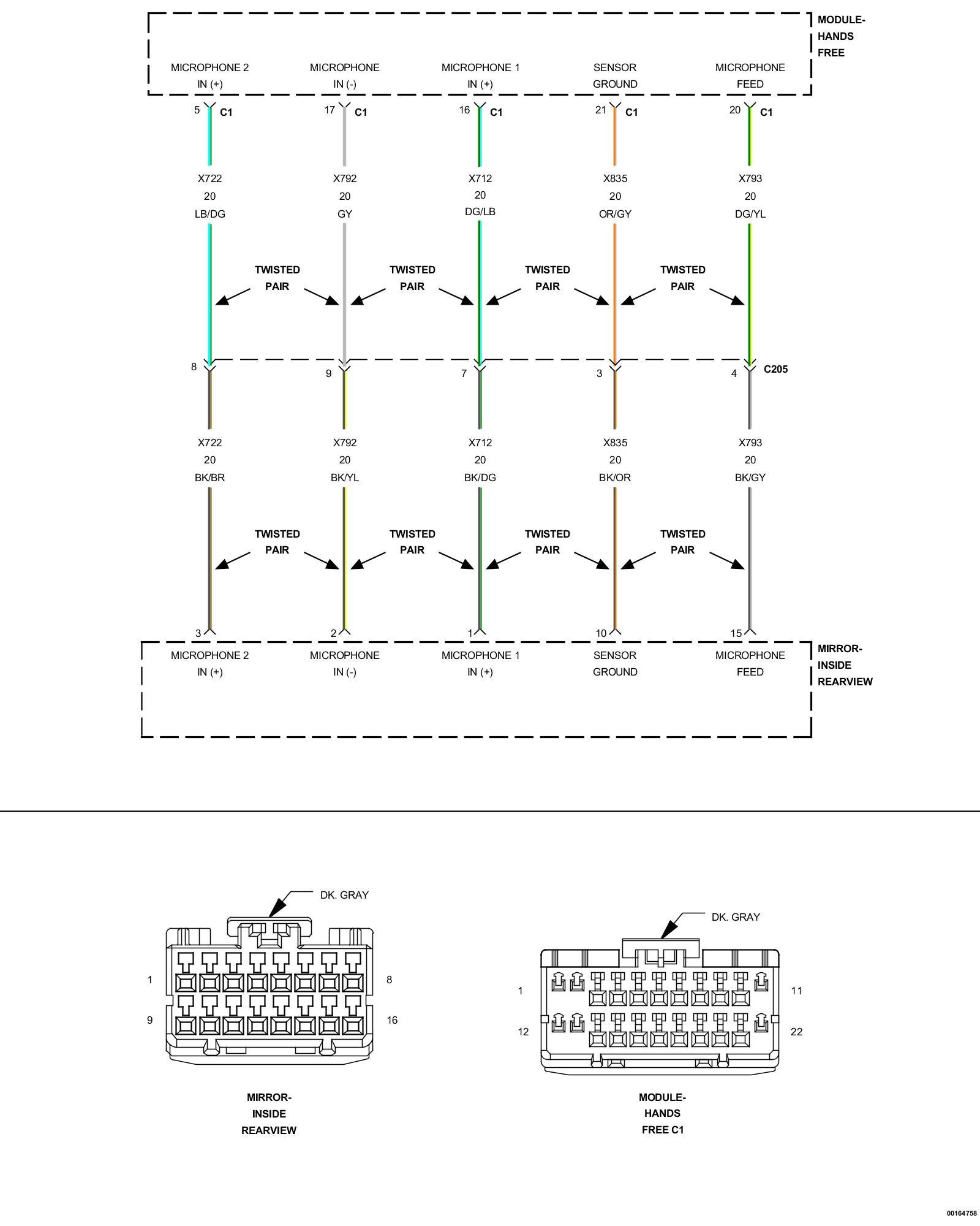 2. Measure the resistance of the (X722) Microphone 2 IN (+) circuit between the HFM C1 connector and the Inside Rearview Mirror connector.