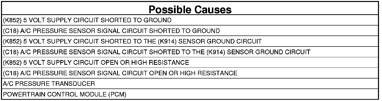 - Repair the (C18) A/C Pressure Sensor Signal circuit for a short to the (K914) Sensor Ground circuit.