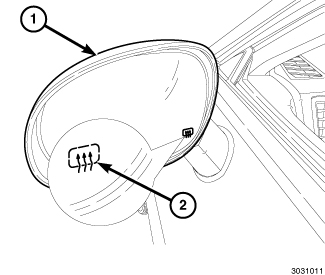 Electrically heated outside rear view mirrors (1) are optional on some models. Vehicles with this option can be visually identified by the International Standards Organization (ISO) icon for rear window defogger (2), which appears on the lower inboard corner of each outside rear view mirror glass.
