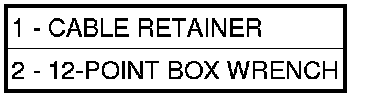 12. Place 13 mm 12-point box wrench (2) over cable retainer (1) at lever bracket as shown to collapse retainer fingers. Pull cable from bracket.